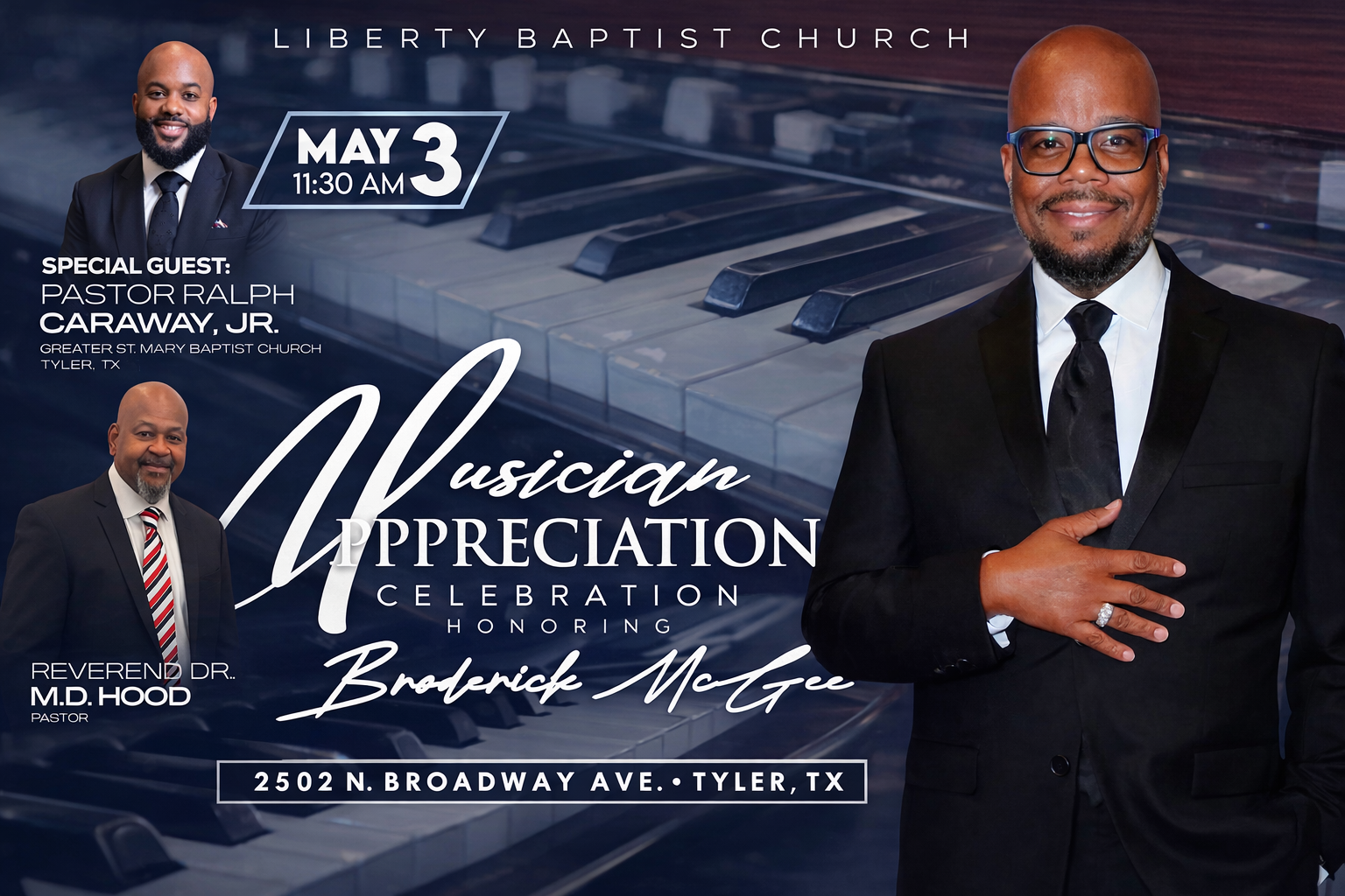 Join us at Liberty Baptist Church for a special and spirit-filled Musician Appreciation Celebration as we honor our very own Minister of Music, Broderick McGee, for his dedication, faithfulness, and excellence in leading worship.
